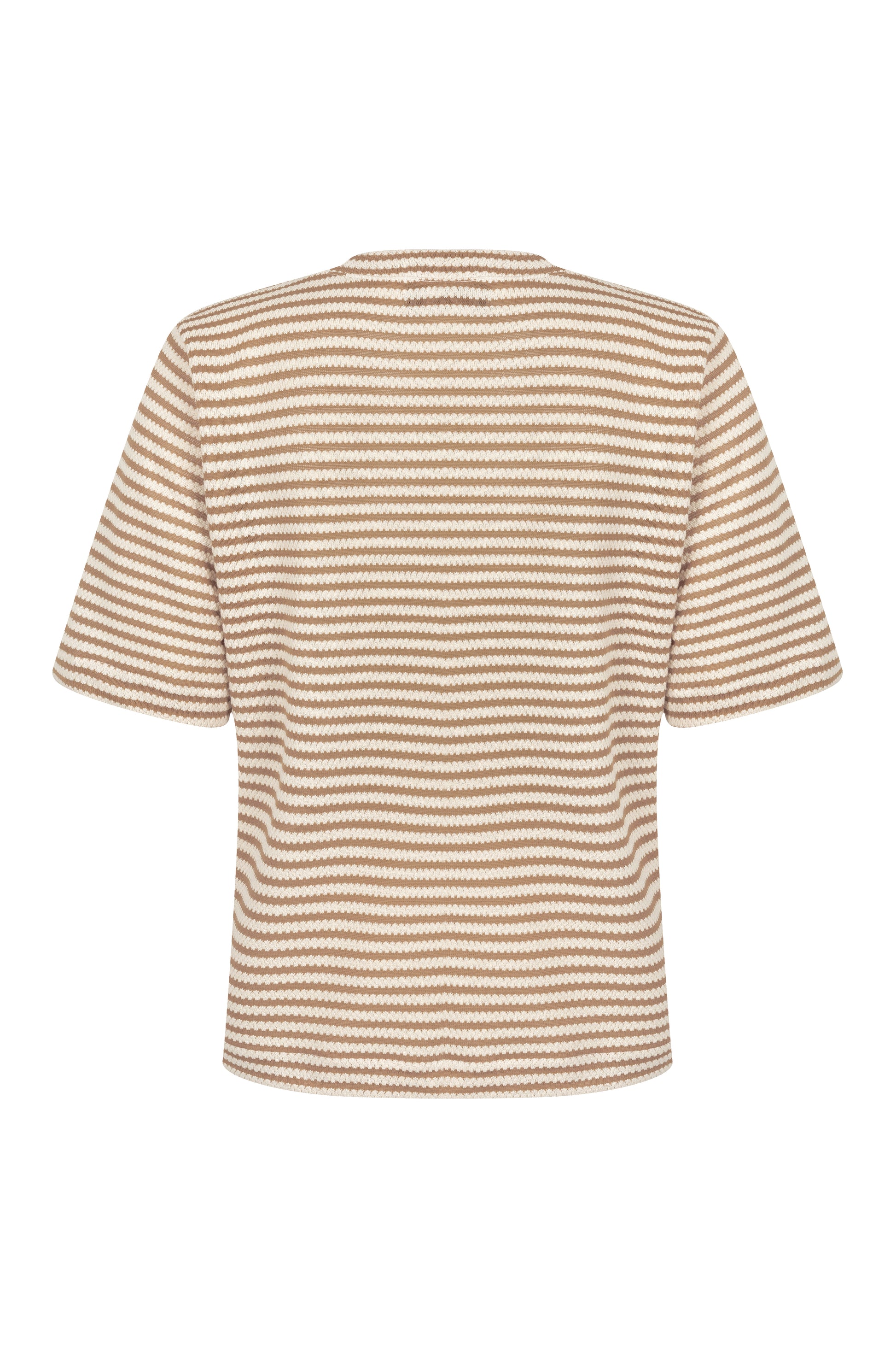 T-shirt em malha tricot leve com listras horizontais em tons de beige e off-white. Possui modelagem reta e gola redonda, garantindo conforto e sofisticação em um visual atemporal. O toque macio e a textura delicada do tricot trazem um charme extra à peça — perfeita para composições elegantes e descontraídas.