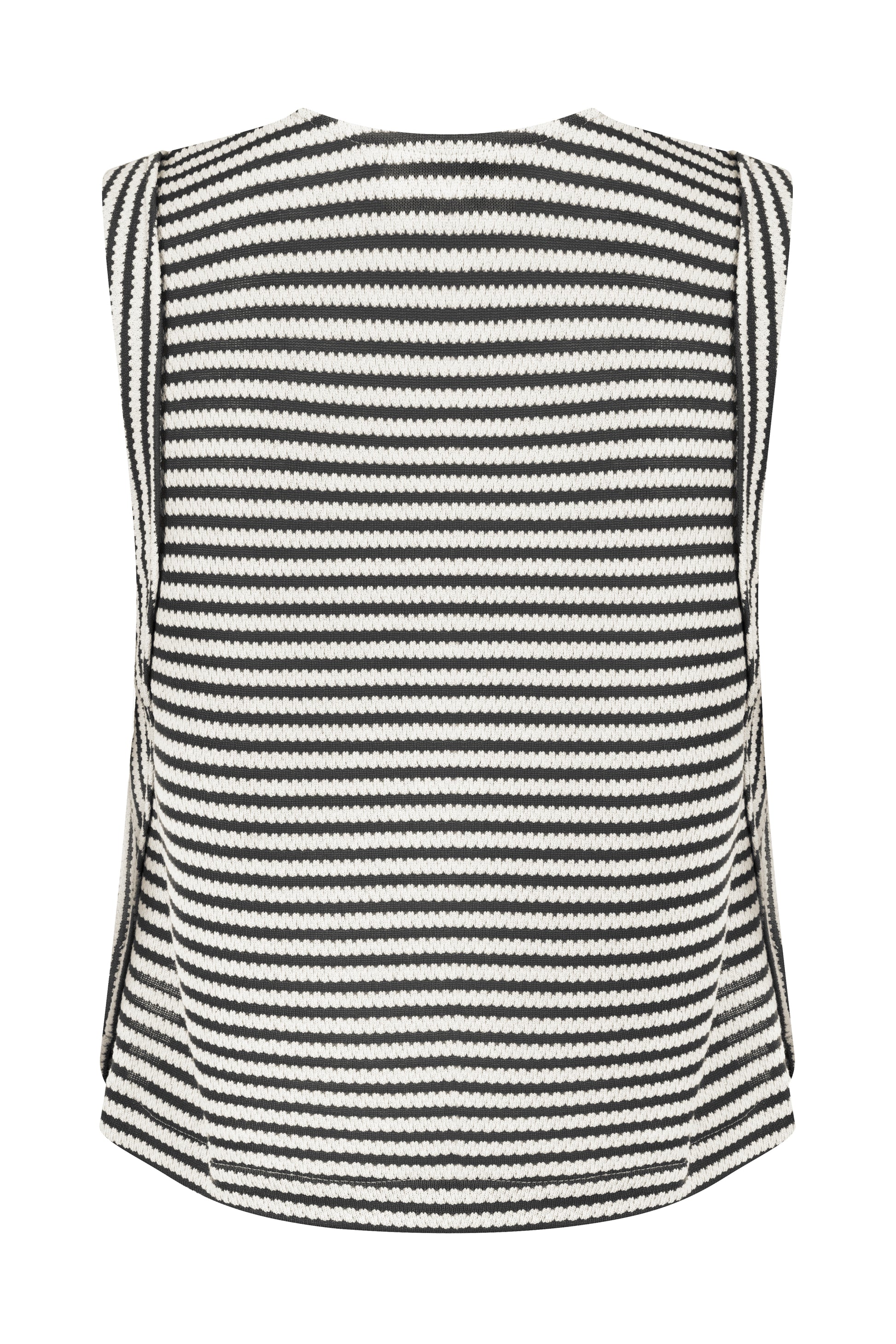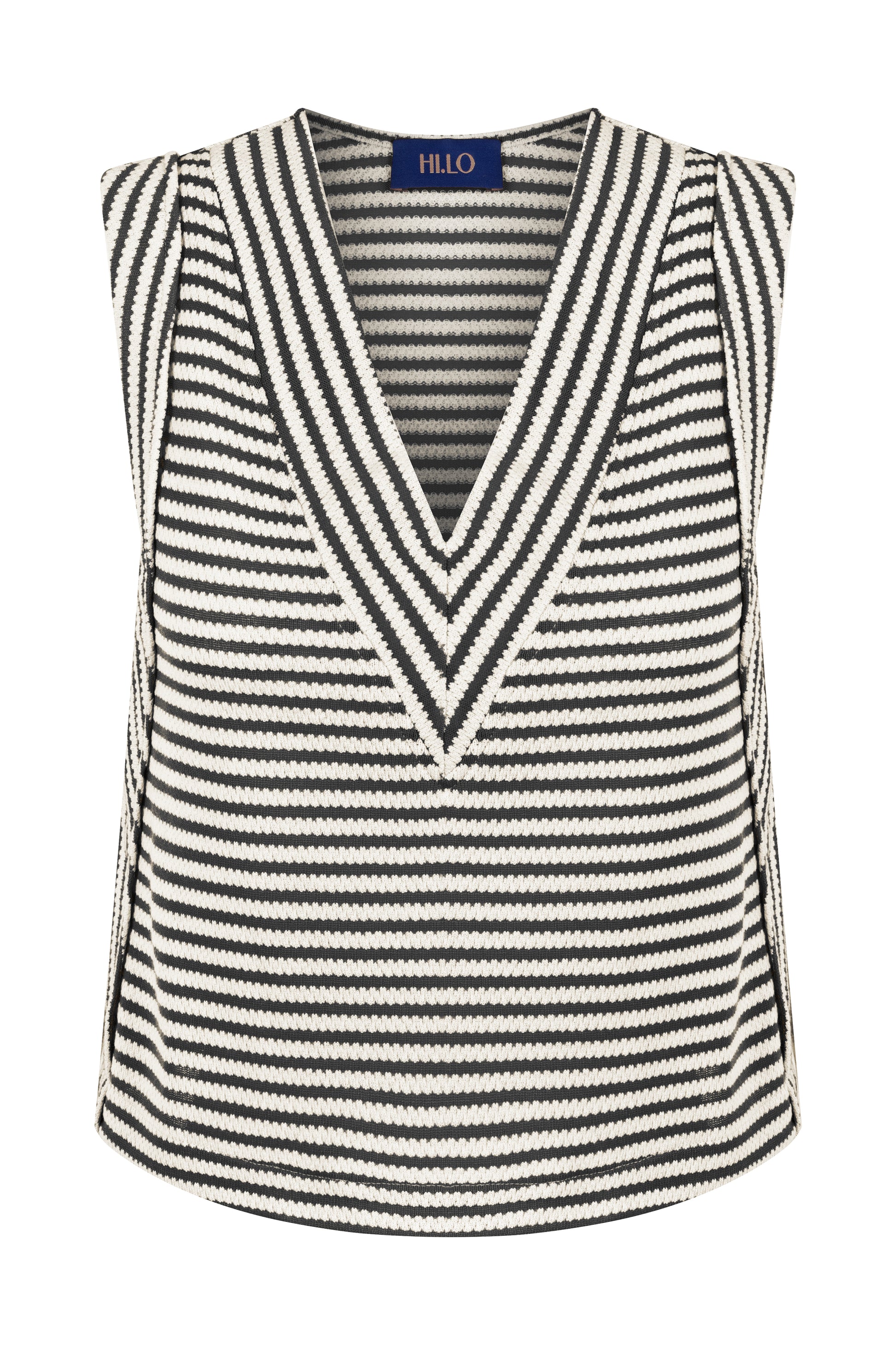 Regata em malha tricot leve com listras em tons de Black e off-white. O toque macio e a textura delicada do tricot trazem um charme extra à peça — perfeita para composições elegantes e descontraídas.